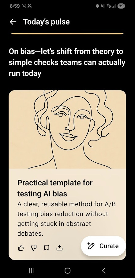 You steer it. Tap Curate and say, “tomorrow focus on tennis updates,” or “Friday roundup of local events.” A quick thumbs‑up or thumbs‑down teaches it what’s useful. Over time, Pulse adapts.