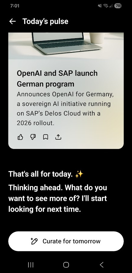 Bottom line: Pulse feels like old‑school RSS got a patient, proactive, intelligent assistant. It keeps the skim, drops the sludge, and gives you a clean on‑ramp to action (no more annoying popups, scroll background ads, or paywalls). If the AI era is a race to “who wows me first,” Pulse makes a strong first move — short, steerable, and done by breakfast. How do you like them cyber omelets?