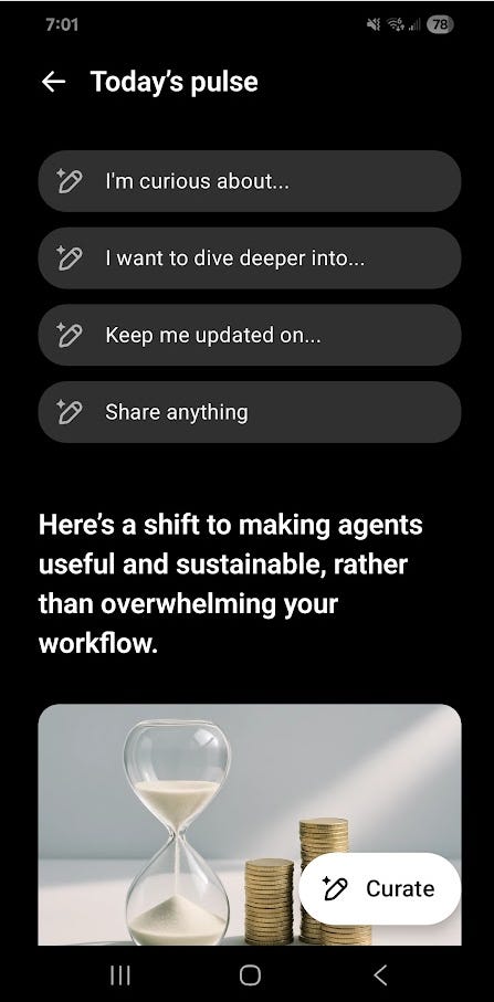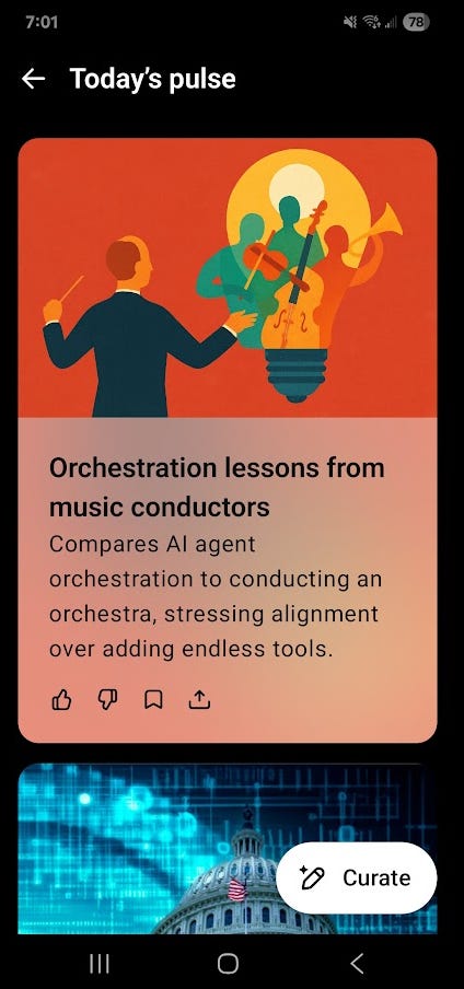 Pulse scratches the same itch RSS did — skim‑able and source‑aware — but it also handles the next step. Cards aren’t just headlines; they’re invitations to act: ask follow‑ups, request a plan, or save the card into an ongoing chat. It’s a small shift with a big effect: from “collect links” to “make progress.”